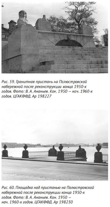 Верхняя терраса пристани ограждена кованой решеткой простого рисунка из вертикальных стержней, охваченных по верху и внизу узкими поясками орнамента с рисунком бегущей волны. Углы террасы закреплены большими гранитными камнями, служившими ранее постаментами для сфинксов. Такие же два сфинкса украшали нижнюю причальную часть пристани — гранитную платформу со ступенями к воде. Лестницы по обеим сторонам террасы украшены красивыми вазами, высеченными из большого куска гранита (рис. 60)"