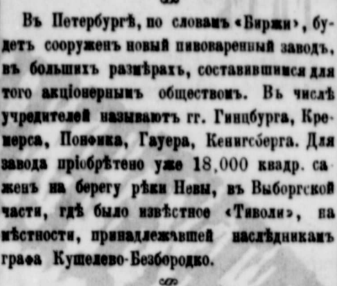 Как начинался пивоваренный завод на Выборгской стороне, "где было известное "Тиволи" на местности, принадлежавшей наследникам графа Кушелево-Безбородко".