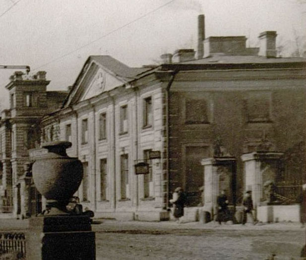 Он выглядит не так, как на чертеже Кваренги, и не так, как сейчас. Очевидно, при приспособлении здания под общину сестер милосердия фасады боковых флигелей (а может быть, и главного здания?!) были изменены. А то, что мы видим сейчас - это результат более поздней реставрации. Когда она была, я не знаю, нигде в литературе не видел упоминаний о ней. И был очень удивлен, увидев этот снимок.