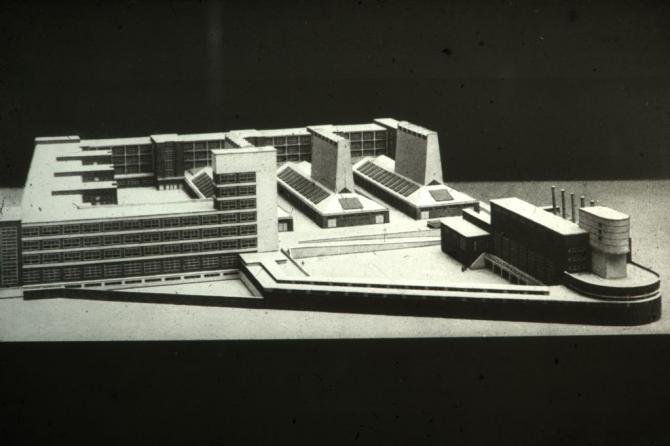 В 1925 г. Ленинградский трест текстильного производства заказал выдающемуся немецкому архитектору Эриху Мендельсону проект нового комплекса фабрики «Красное знамя». Весной 1926 г. один из вариантов был утвержден, и началось строительство. Мендельсон спланировал единый комплекс, занявший целый квартал. Доминантой его стала силовая станция, поставленная на остром углу квартала. Ее пластически экспрессивная композиция с нависающим закругленным объемом водонапорной башни внесла резкий динамизм в пространственную организацию предприятия. Архитектор метафорически уподобил это сооружение «кораблю, который тянет за собой все производство». Вторым вертикальным акцентом должна была стать прямоугольная башня заводоуправления. Три цеха внутри двора проектировались с высокими надстройками трапециевидного сечения - вентиляционными шахтами. Здесь Мендельсон варьировал прием, примененный им ранее в цехах шляпной фабрики в Люккенвальде (Германия). С трех сторон квартал обступают четырехэтажные производственные корпуса, имеющие железобетонный каркас, кирпичную облицовку и горизонтальные полосы остекления. Новаторский и остро выразительный проект Мендельсона был встречен неоднозначно. В сравнительно консервативной среде ленинградских архитекторов, чьи корпоративные интересы были ущемлены тем, что заказ получил иностранец, у него было много противников. В ходе строительства, осуществленного в две очереди (1926 - 1929 и 1934 - 1937 гг.) авторский замысел был сильно искажен и упрощен. Лишь силовая станция (1926 - 1928) точно воплощает оригинальный проект. Именно это сооружение, в котором особенно сильны черты экспрессионизма, оказало заметное влияние на новую ленинградскую архитектуру, особенно на творчество Н.А. Троцкого. (М. С. Штиглиц, В. И. Лелина, М. А. Гордеева, Б. М. Кириков "Памятники промышленной архитектуры Санкт-Петербурга, "Белое и черное" СПбю 2005 г. С. 122-123)