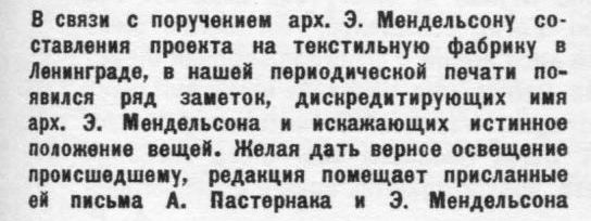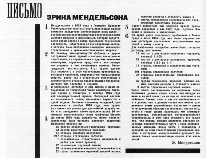 Строительство фабрики нвчалось в июне 1926 г. под руководством инженера Е. А. Третьякова. Рабочие чертежи выполнили на основе авторского проекта опытные ленинградские архитекторы И. А. Претро и С. И. Овсянников. В 1927 г. Мендельсон был вынужден отстраниться от надзора за строительством, а затем отказаться и от авторства осуществленного предприятия (впоследствии свой проект фабрики он датировал начальной стадией - 1925 г.). Постройка цехов велась в две очереди: первая завершилась в 1928-1929 гг. монтажем привезенного из Германии оборудования, вторую удалось закончить лишь в середине 1930-х гг. Проект Мендельсона был реализован не полностью и в обедненном виде. Из существующих зданий только силовая станция в точности соответствует авторскому замыслу. Остальные постройки лишь с большой долей условности можно считать его произведениями. Из четырех корпусов, которые должны были располагаться с трех сторон участка, был возведен только главный трикотажный цех. Протяженное здание воспроизводит основную структурную схему исходного проекта: метрический ритм железобетонного каркаса с геометрической решеткой на фасадах, максимальные площади стекла, выступающие во двор прямоугольные объемы. Краснокирпичная облицовка узких простенков и светлые полоски перекрытий создают звучный декоративный эффект и выявляют тему горизонтального остекленения.Ровный шаг каркаса, как бы уходящий в бесконечность, содействует равномерному естественному освещению обширных внутренних пространств. Сильнее были изменены три внутридворовых цеха. Они лишились главных элементов - выразительных по силуэту вентиляционных надстроек трапециевидиного сечения. Конструктивной основой одноэтажных строений служат железобетонные рамы. На продольных сторонах снаружи выступают расширяющиеся кверху ребра, двускатные крыши прорезаны фонарями верхнего света. Внутри цехов открываются в чистоте своих формупругие несущие конструкции. Подлинным шедевром Мендельсона является здание силовой станции, играющее ведущую роль в пространственной организации композиции. Могучий экспрессивный силуэт сооружения с динамичными закругленными объемами доминирует в перспективах пересекающихся улиц. Силовая станция состоит из трех частей: центрального отделения - котельной, турбинного зала и отделения водоподготовки. Интерьер котельной впечатляет колоссальным масштабом, брутальной мощью железобетонных конструкций - столбов и ребристого перекрытия, гигантскими воронками бункеров. Внешний образ сооружения определяется сочетанием железобетона, клинкерного кирпича и стекла. Прямоугольный блок вдоль Пионерской ул. заключен в краснокирпичное обрамление и пронизан жестким ритмом железобетонных рам, чередующихся с узкими вертикальными прорезями. С противоположной стороны промежутки между стойками заполнены витражами. Резкие различия форм и размеров проемов обусловлен технологическими особенностями отделений. С прямоугольным блоком констрастно взаимодействуют пластичные закругленные объемы, врезанные тремя ярусами в глухой кирпичный торец. Динамичный напор скульптурных масс, устремленные вперед выступы поавных обтекаемых очертаний, нависющая верхняя часть тяжеловесной башни определяют неповторимую индивидуальность и образную силу экспрессионистической композици
