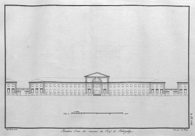 Комплекс казарм включал двухэтажные солдатские и трехэтажный корпуса, , полковую школу, манеж, кузницу, помещения хозяйственной роты.