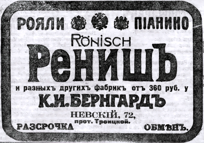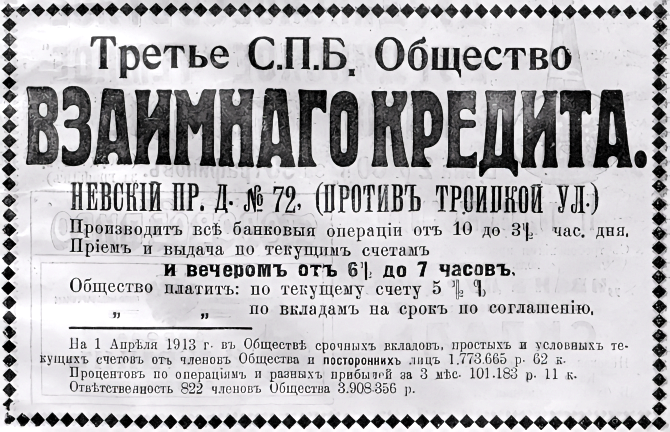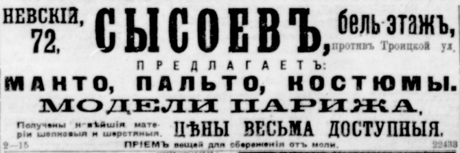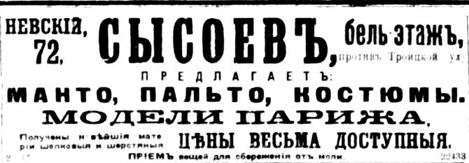 Новые постройки в центре Петербурга. Только что открытый фасад дома против Троицкой ул. на Невском проспекте представляет вопиющее, по своей несогласованности со всею, уже годами установившеюся, физиономией проспекта, вольнодумство; пошлейшие формы эклектического затасканного петербургского ренессанса гораздо спокойнее и терпимее рядом с этим «чухонским модерном», украшенным какими-то головами «леших», и выкрашенным в светло-коричневый тон. (Георгий Лукомский. «Зодчий», 1910, Вып. 17, С. 185., добавил )