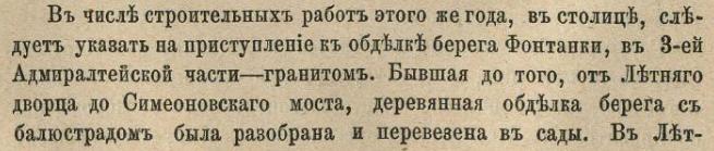 ... «через Фонтанную реку хотя прежде назначено мосту быть каменному только с берегов, а в средине деревянному подъемному, но для прочности имеет быть весь каменный со сводами». ... Таким образом, первоначальный проект предусматривал прямые лестницы, врезанные в берега, разводной мост на Фонтанке и железные ограждения вместо каменного парапета. (Кочедамов В.И. 1954 Набережные Невы, С. 32)