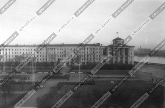 Однако официальная литература дает иные сведения: Реконструкция территории у Невы велась в послевоенные годы по проекту арх. Н. В. Баранова, Н. Г. Агеевой и Г. И. Иванова. По их же же проекту с восточной стороны площади в 1948-1954 гг. было возведено монументальное административное здание (д. 1). Соседний д. 3 (арх. А. А. Юнгер, В. Д. Голли, П. Н. Жуковский, перестроен Я. Н. Лукиным) с портиками в верхних этажах продолжает ритмический строй ансамбля площади.
