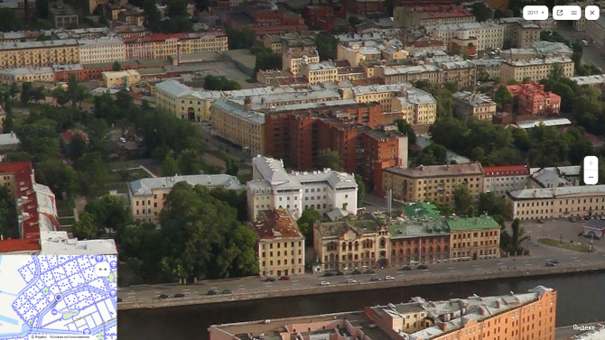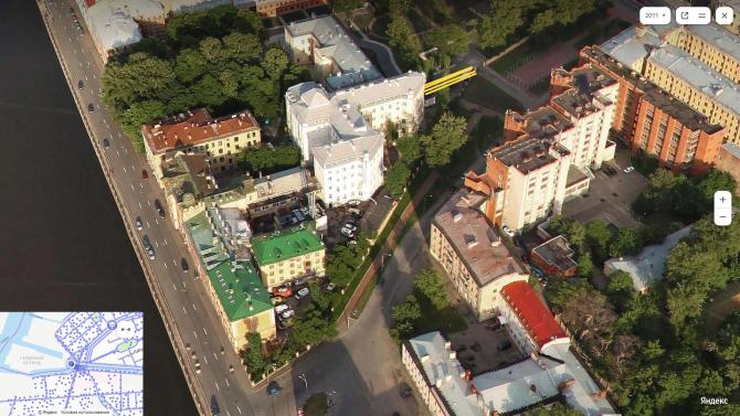 У современного вида не хватает одного флигеля слева, но боковой его фасад виден.