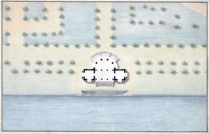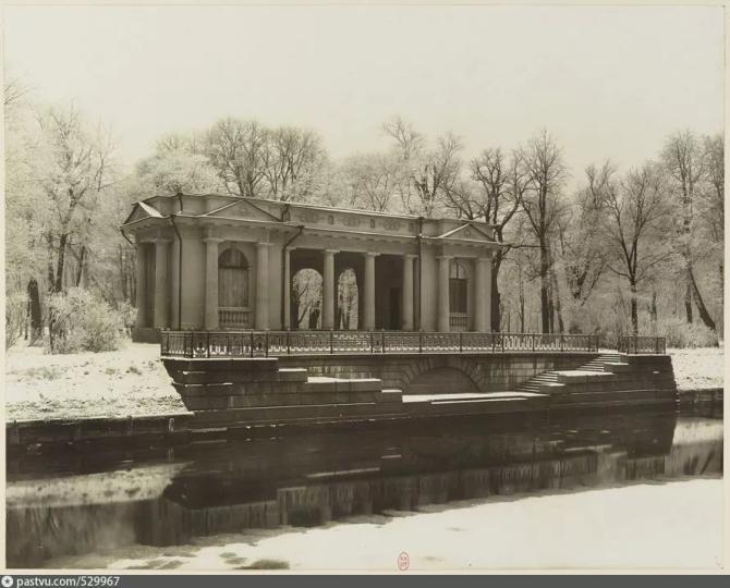 * Аннотация: Вид с набережной реки Мойки на садовый павильон с пристанью в Михайловском саду ("павильон Росси", 1825 г., архитектор К.И.Росси).