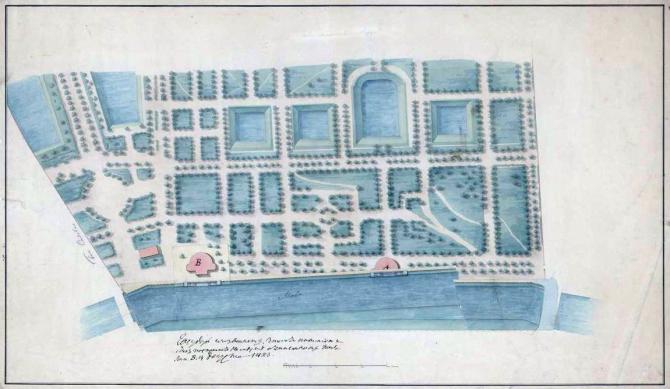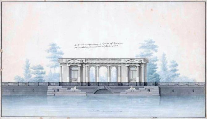 При реконструкции Михайловского сада по проекту арх. К. И. Росси, А. А. Менеласа и садового мастера Д. Буша на берегу Мойки по проекту Росси построили гранитную пристань и павильон с дорической сквозной колоннадой и полуротондой.