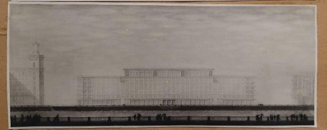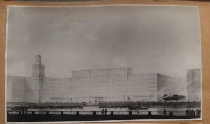 Проект студенческого общежития ЛИСИ стал последней работой арх. А. А. Оля. Выполнен в соавторстве с С. И. Евдокимовым и Н. А. Устиновичем, 1957 г.