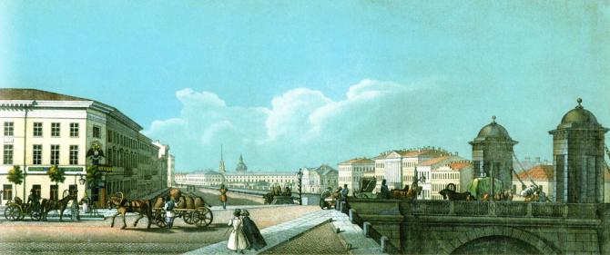 * Аничков мост, вид от дворца Нарышкиных гравер Александров Павел Алексеевич Гравюра №33 из альбома Плюшара 1824 г. ** В ночь на 6 ноября 1942 г. фугасная бомба весом в 250 кг попала в Аничков мост. Взрывом смело в Фонтанку чугунные тумбы и более 30 м чугунной решетки. На мосту остались лишь изуродованные осколками гранитные постаменты. Но уже во время войны решетка моста была заново отлита на заводе и вновь установлена на мосту. (добавил ) *** Аннотация: Панорама набережной реки Фонтанки со стороны Аничкова моста и скульптурная группа с конем работы П.К.Клодта (1785 - строители - инженеры И.Герард, П.К.Сухтелен; 1841 - перестроен - инженер И.Ф.Буттац, архитектор А.П.Брюллов).