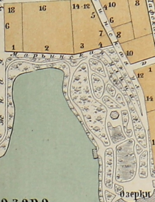 На высоком берегу Среднего озера между Ольгинской ул. (Эриванская ул.) и Славянской наб. возвышался трехэтажный огромный особняк А. Оппенгейма - гласного губернского земства и члена правления "Шуваловского товарищества". Сгоревшая в июне 1910 г. дача называлась "Вилла Бельмонт" и напоминала средневековый замок с зубчатыми стенами, с высокой башней-бельведером, на которой всегда развивался флаг. Из героев дачного фольклора мишенью острот был глава семьи, который, вывезя домочадцев в пригород, был вынужден каждый день таскаться на службу, а вечером возвращаться на дачу, обвешанный пакетами и свертками. (Квартальный надзиратель, N55)