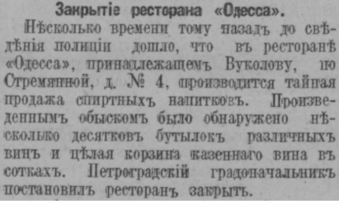 "Только что закончился капитальный ремонт ресторанного заведения по III разряду “Одесса”, занимающего по Стремянной у. целый дом под № 4 и принадлежащего Бр. Вуколовым. Переделана “Одесса” заново так, что ее положительно нельзя узнать. Совершенно выломано 5 стен. Опущен пол на аршин. Под весь потолок нижнего помещения подведены балки. Устроены внизу и вверху два зала, расширены кабинеты, кухня, прибавлен кладовые, проделан новый ход в биллиардную. Расширив все помещения ресторана, Д. И. Вуколов поставил также всю новую обстановку. Приобретена новая мебель, всюду проведено электричество. <...>" (Ресторанное дело.1911. № 11. С. 8-9). "Одесса" была успешным заведением. Однако события Первой мировой воны в корне изменили ситуацию. В 1915 г. последовало распоряжение градоначальника: "В ресторане Вуколова, в д. № 4 по Стремянной ул., обнаружены хранение и продажа посетителям спиртных напитков. В виду сего, на основании и. 12 ст. 19 прил. к ст. 23 общ. учр. губ. (Св. Зак, т. II), постановляю: означенный ресторан закрыть, исполнение чего возлагаю на пристава 1-го участка Московской части." (Ресторанное дело. 1915. № 7. С. 12.)