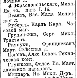 1926: Производственные мастерские парусиновых изделий Шлиссельбургского Горисполкома; Дамские и детские вещи; Платье, Стремянная, 4. («Весь Ленинград - 1926", С. 178, 375, 430) 1927: Трудовая артель «Книга», , Стремянная, 4. («Весь Ленинград - 1927", С. 184). 1928: «Книга», кооперативная артель; Канцелярские принадлежности и писчебумажные магазины, владелец Краут В. М.; Чайная, Малофеев С. М., Стремянная, 4. («Весь Ленинград и область - 1928". С. 193, 210, 468, 545) 1929, 1930: «Время», кооперативное товарищество, Стремянная, 4. («Весь Ленинград и область - 1929". С. 165, 481), («Весь Ленинград и область - 1930". С. 175, 480) 1931: «Время», кооперативное товарищество; „Кооппарикмахер", входит в общество „Ленразнопромсоюз"; склад издательства «Время», Стремянная, 4. («Весь Ленинград - 1931". С. 183, 214, 415) 1932: Строительный трест райжилотдела Смольнинского района; Магазии Ленинградской областной конторы «Союзплодовощь»; «Время», кооперативное товарищество; «КОИЗ», Всесоюзное кооперативное объединенное издательство, Ленинградское отделение; «Ленинградская промкооперация», журнал издательства «К0ИЗ», Стремянная ул., 4. («Весь Ленинград - 1932". С. 149, 280, 322, 323, 331) 1933: Артель «Время», книжное издательство, входит в систему Ленпромпечатьсоюза; «Время», кооперативное товарищество, в ведении Ленпромпечатьсоюза; КОИЗ», Всесоюзное кооперативное объединенное издательство, Ленинградское отделение; «Ленинградская промкооперация», журнал издательства «К0ИЗ», Стремянная ул., 4. («Весь Ленинград - 1933". С. 113, 354, 356, 364) 1934: Товарищество «Время», издательство переводной художественной литературы, Стремянная ул., 4. («Весь Ленинград - 1934". С. 130) 1935: Ленинградская областная комиссия по улучшению жизни детей при президиуме Ленсовета, Управление общественными доходами КУЖДа, Стремянная ул., 4. («Весь Ленинград - 1935". С. 26) 1937: Производственный комбинат бытовых предприятий Куйбышевского райжилищсоюза, Стремянная ул., 4. (1937- Ленинград список абонентов", С. 291) 1939, 1940: Хозяйственно-бытовая контора 2-го районного жилищного управления, Стремянная ул., 4. («Ленинград - 1939", с. 14).(«Ленинград - 1940", С. 20). 1965: Жилищно-коммунальный отдел райсовета Куйбышевского р-на, Стремянная ул., 4. ([], С. 92) 1973, 1976, 1988: Кожно-венерологический диспансер Куйбышевского р-на № 14, Стремянная ул., 4. ([], С.64), (Краткий справочник ЛГТС-1976", С. 92), ([], С. 104) 1992: Диспансер (пояснит.надпись) (план Треста ГРИИ. 1992) 2009: Диспансер кожно-венерологический N11 (КВД N11) - Стремянная ул., 4 Примечание: Отделение N3 (Телефонный справочник «Весь Петербург-2009») 2009: "Тирупати" (севенирная продукция) - Стремянная ул., 4 (Телефонный справочник «Весь Петербург-2009») 2014: Кожно-венерологический диспансер № 11 (2-е отделение) Центрального района - Стремянная ул., 4 (добавил ) 10 комментариев 2348 просмотровДобавил: Blackadder, 21 Марта 2009, 20:22