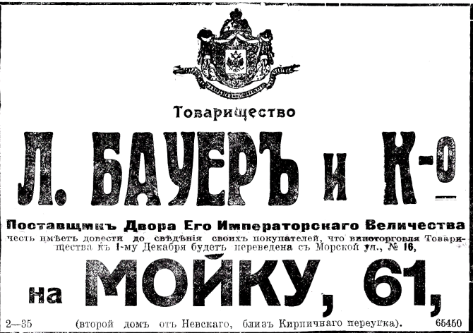 В 1880, когда Бауер получил привилегию на поставку вина к Императорскому двору (ранее ею пользовался английский магазин "Никольс и Плинке"), было открыто отделение в Петербурге, сперва на Невском пр., 4, а позднее - в обширном помещении магазина на Морской ул.,16. Петербургское отделение возглавил сын основателя Александр Леонтьевич Бауер (являлся испанским консулом с толице).