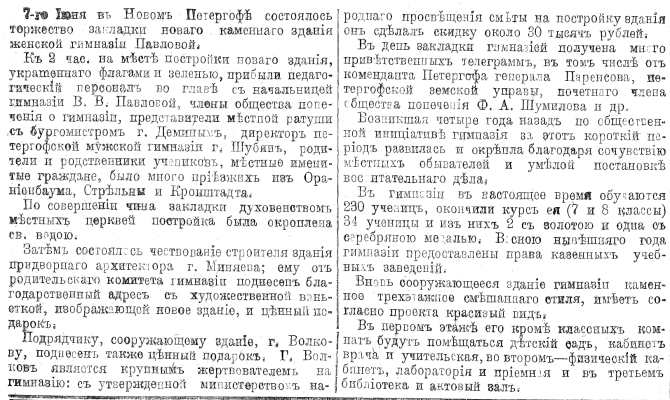 «В конце 1905 г. Петергофской общественностью на роль учредительницы частной женской гимназии была выдвинута Вера Васильевна Павлова, и 1 февраля 1906 г. ей было разрешено открыть в городе Петергофе частное учебное заведение для девочек. 7 февраля в частной квартире супругов Павловых на Кадетской улице начались занятия для первых двух учениц…
