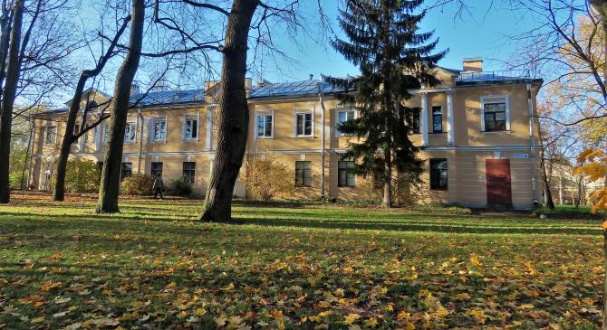 На парковой стороне улицы ...выглядывает неоклассицистский фасад двухэтажного здания. Это одна из казарм Собственного Е.И.В. Сводного пехотного полка, возведенная в 1910-е гг. архитектором В.И. Яковлевым (Дворцовая ул. 6). От этой казармы начинается ряд из десяти полковых зданий, выстроенных вдоль Дворцовой улицы и Фермской дороги. Полк осуществлял охрану императора и нес караульную службу у Александровского парка. ([] с. 261)