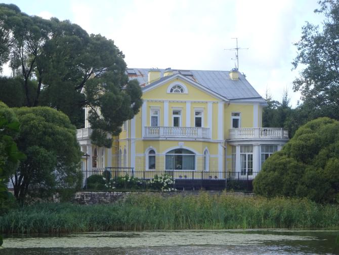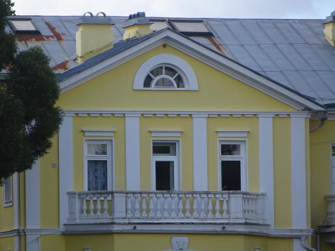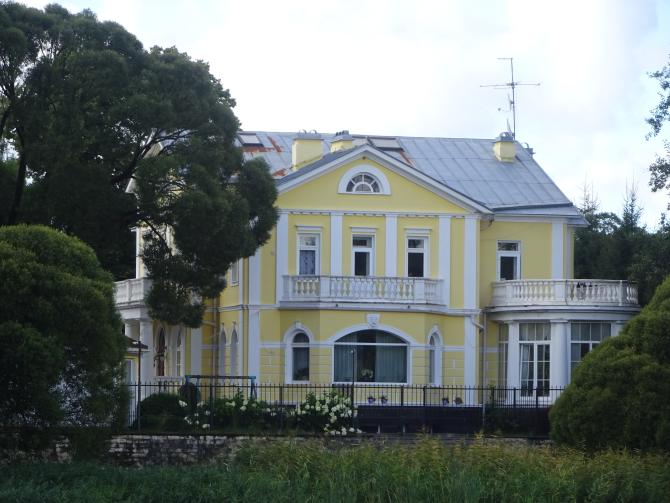 Современный каменный особняк на огороженной территории с хозяйственными постройками. Стилистически носит черты ретроспективизма, апеллируя в основном к классицистическим формам.