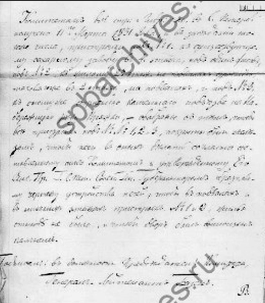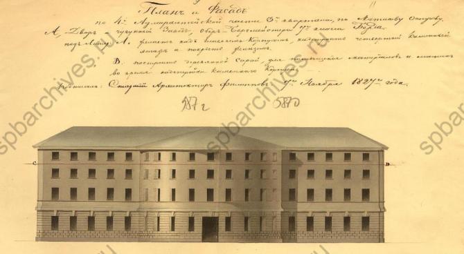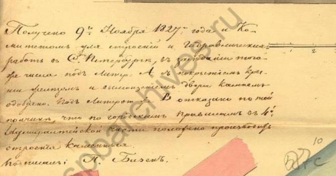 "Получено 9-го ноября 1827-о года и Комитетом для строений и гидравлических работ в С. Петербурге, в заседании того же числа под литер. А с покрытием крыши железом и вымощением двора камнем одобрено. Под литерою же В отказано по той причине, что по городским правилам в 4-й Адмиралтейской части положено производить строения каменные.