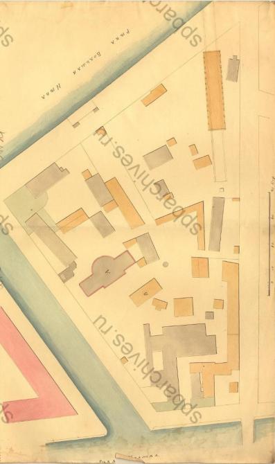 На всех планах хорошо видно, что главный корпус Чугунного завода Берда, со значительным полукруглым выступом, стоял прямо за корпусом вдоль канала. Его торец хорошо виден на литографии с пароходом. Здание тоже 18 века, надстроенное 4-м этажом в 1827 году. Его чертеж размещен в публикации по Перевозной, 1. Думаю, имело бы смысл разместить его здесь. Но у меня почему-то нет среди скопированных цельного листа (л. 587), только фрагменты: шапка с фасадом, текст с резолюцией П. Базена и генеральный план квартала. Повешу все же.
