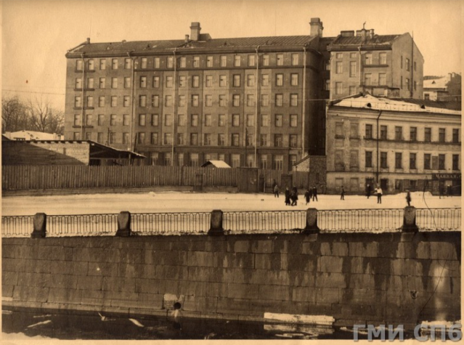 На фото 1926-го г. здание еще достраивается. Учитывая размеры здания (три корпуса буквой "П" - один шестиэтажный и два пятиэтажных) и дату, можно предположить, что тут имелся дореволюционный задел. На фото 1932-го г. здание уже заселено. В книге Ю. Кружнова "История квартирного вопроса в России, или коммуналки навсегда" приводятся воспоминания Т. Е. Мерсадыковой, семья которой жила в этом доме с 1928 по 1949 г. "По соседству с дворцом Юсуповых во дворе Железнодорожного института, что на углу Московского и Фонтанки, построили "коммунистический дом". Дело было в 1926 году, когда быт унижал женщину, семья становилась пережитком прошлого, а интересы нового человека - общими и возвышенными. На каждом этаже был длинный коридор буквой П. Направо и налево - двери в комнаты, где проживали чуждые мещанству строители нового общества. В ножках буквы П располагались массовые коммунальные удобства: 2 умывалки (мужская и женская), о шести кранах каждая, и 4 одноместных туалета. В этих же ножках, а также в углах изгибов огромные помещения были отведены под "рекреации". Предполагалось, что избавленные от унизительного быта коммунальщики будут проводить там культурный досуг, беседуя, читая вслух и слушая музыку. Кухни не предусматривалось. Для удовлетворения такой вымирающей потребности, как желание поесть, предназначалась домовая кухня, куда коммунальщики, не прерывая мирных бесед о светлом будущем, должны были стройными рядами спускаться трижды в день. К чести экспериментаторов надо сказать, что при доме имелась своя прачечная и кочегарка. Они даже работали - в отличии от домовой кухни. Дом постепенно заселялся, а домовая кухня все не появлялась. Одни бессознательные новоселы ставили керосинки и примусы прямо в комнатах. Другие - желающие вести возвышенные беседы во время приготовления обеда - выносили их в рекреации, от чего там пахло жареной рыбой и щами, а не мечтами о светлом будущем.
