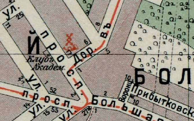 Мне кажется, недавно кто-то публиковал схему, начиная от района пл. Мужества, где были обозначены старые адреса, в том числе и этот. Не помню по какому адресу.