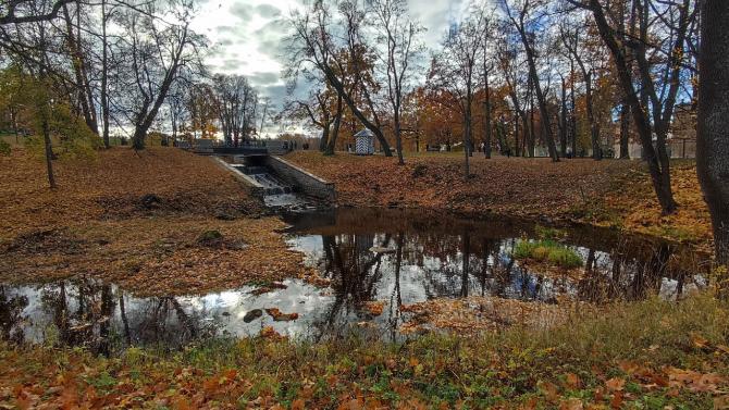 Самым большим из водоемов Дворцово-паркового комлекса является Нижний (Дворцовый) пруд (882 кв. м). Дворцовый пруд образован в 1711 г. путем строительства запруды-плотины с деревянными шлюзами и мельницей на реке Карасте. По специально устроенному каскаду, речка устремляет свой бег к заливу по живописной ложбине. С севереной стороны пруда над водопадом перекинут мост. Первоначально, в XVIII в. - деревянный, в XIX в. - каменный. В начале 1900-х гг. мост оформлен чугунной оградой с применением железобетона. ([]. С. 69, Mary)