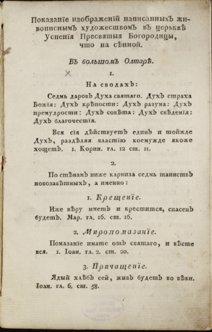 Таким образом церковь заложенная в 1753 г. с внешней стороны была закончена в 1762 г. – год восшествия на престол и коронования императрицы Екатерины II. Внутренние же устройство церкви было доведено только до половины; готов был только один придел во имя Трех Вселенских Святителей, освященный 20 июня 1761 г., второй придел – во имя прп. Саввы освященного – освящен 2 октября 1764 г. и третий, главный храм во имя Успения Божией Матери, освящен в день ангела строителя церкви – 5 декабря 1765 г. Впоследствии по сторонам главного алтаря были пристроены еще два придела. На южной стороне устроен алтарь во имя Всемилостивого Спаса, празднуемый 1 августа, придел освящен 14 января 1822 г.; на северной стороне устроен придел во имя архистратига Михаила, придел освящен 14 февраля 1835 г. Таким образом церковь относилась к числу пятипрестольных одноэтажных. Высота ее до креста главного купола 23 с. 2 арш., длина до солеи 21 саж. 2¾ арш., ширина по середине церкви 14 саж. 1 арш. Спасосенновская церковь до настоящего времени сохраняет тот же самый вид, в каком она была в первое время после построения.