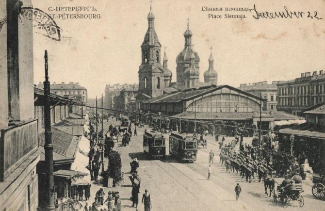 Многие из горожан еще помнят этот темно-зеленый пятиглавый храм с высокой колокольней над входом, взорванный январской ночью 1961, чтобы освободить место для новой станции метро. Сейчас, лишившись архитектурной доминанты, площадь утратила свой неповторимый облик и выглядит уныло и однообразно, даже после недавней реконструкции. В 1743 у сенновских купцов во главе с И. М. Гроздовым возникла мысль о постройке деревянного храма, но через два года они решили возвести каменную церковь во имя Воздвижения Креста Господня с приделом мч. Харлампия. В 1751 было дано разрешение на постройку трехпридельной Сретенской церкви. Поначалу купцы купили на Выборгской стороне деревянную , которую освятили 18 июля 1753 на новом месте. Через два дня архиепископом Сильвестром была заложена каменная церковь, возводившаяся на „порожнем месте“ и в основном на деньги богатого откупщика С. Я. Яковлева. Возможно, ее автором, был знаменитый Б. Растрелли, который построил неподалеку несохранившийся дворец богача.