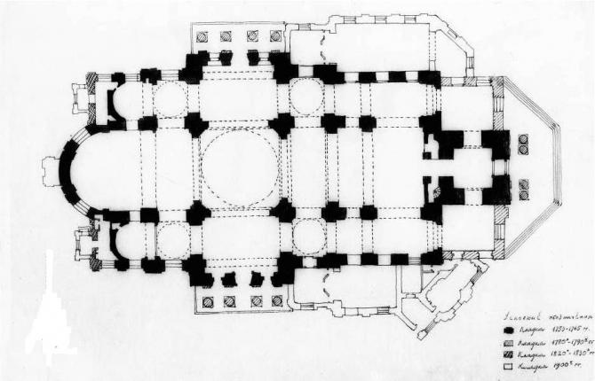 1753-1761 - арх. Растрелли Ф.-Б. (?), Квасов Алексей Васильевич 1816-1817 - арх. Руска Луиджи - перестройка, портал 1833- 1835 - арх. Мельников Авраам Иванович- перестройка, купол 1867 - арх. Карпов Григорий Иванович - перестройка 1901-1904 - арх. Карпов Григорий Иванович - пристройка притворов