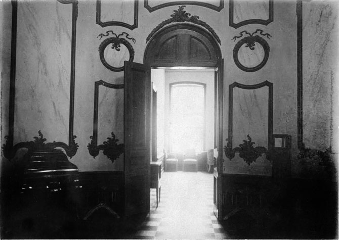 Но особенно интересна верхняя фотография. Обратите внимание: фасад выглядит почти так же, как на этой фотографии - те же пропорции, такие же форма и расположение окон и их наличники, такие же срезанные углы по сторонам. Но есть одно отличие: здесь фасад украшен в центре четырехколонным портиком, а на той фотографии - нет. Очевидно, это два разных фасада одного и того же здания. Какой именно фасад изображен на данной фотографии, мы поймем, если посмотрим на план дворца. Колонны стояли у заднего фасада, а на боковых фасадах их не было.
