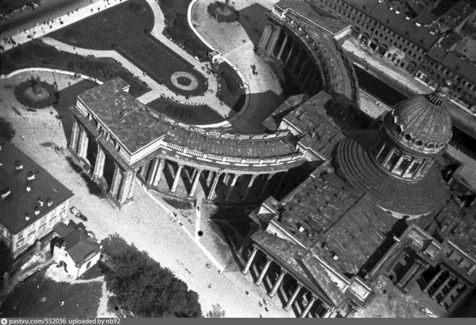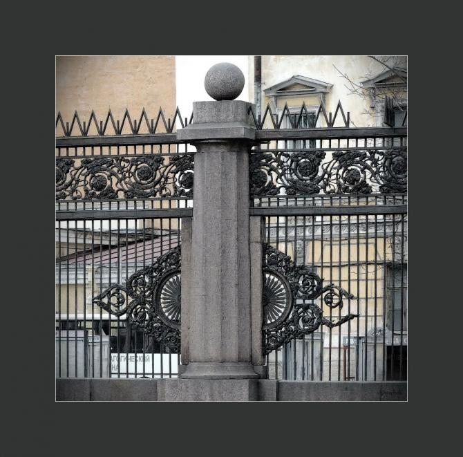 "Решетка упирается в колоссальные гранитные пьедесталы, которые предназначались для монолитных статуй апостолов Петра и Павла. Но, к сожалению, нужные для этого глыбы не были довезены, и одна из них еще до 80-х годов XIX века лежала в Аптекарском переулке."