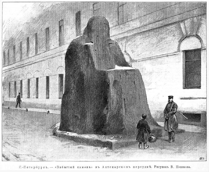 "Гранитный монолит, находящийся в Аптекарском переулке, возле здания казарм л.-гв. Павловского полка, где он благополучно простоял более 3/4 столетия, наконец будет снят с места и употреблен как материал при постройке храма Воскресения Христова. Эта громадная каменная глыба, как известно, была привезена в Петербург во время сооружения Казанского собора и предназначалась для изваяния одной из фигур, которые по проекту предполагалось поставить в полукружии колоннады этой церкви. Это предположение однако почему-то не осуществилось, и колоссальная гранитная глыба с тех пор оставалась как бы забытой, несмотря на то, что ощутительным образом стесняла проезд и без того узкого переулка и заслоняла в окнах нижнего этажа свет. Уборка этой своеобразной среди улицы Петербурга преграды потребовала бы, конечно, значительных издержек; но кроме этого, затруднение - и, пожалуй, главное - заключалось в том, что оставалось совершенно неизвестным, чью собственность составляет этот во всяком случае довольно ценный строительный материал. Даже и теперь, когда по мысли командира Павловского полка, нашедшего удобный способ избавить здание казарм от неудобного соседства камня, предложено было столичной Городской Управе сделать технический осмотр на месте, в видах возможной от перенесения столь значительного груза опасности повреждения соседних строений, вследствие нарушения равновесия, - Управа не взялась решить вопрос по существу собственной властью; она довольствовалась дачей заключения технического свойства - о безвредности для смежных строений при снятии камня и справкой о том, что камень не значится в описи имущества Казанского собора, решение же вопроса по существу предоставила С.-Петербургской Городской Думе.