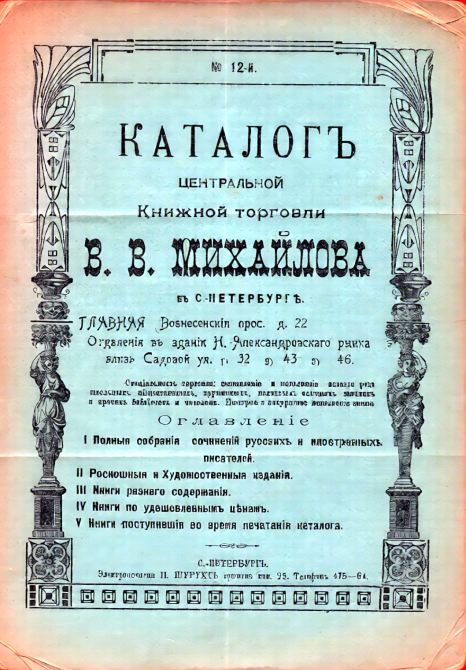 «Что может быть лучше и приятней как собрать коллекцию фотографических карточекъ знаменитыхъ людей, самой лучшей художественной работы съ последнихъ снимковъ. Для каждого доступно по цене, еще до сего времени не бывало. Прошу обратить внимание и убедиться въ изящной работе карточекъ въ большомъ выборе и разных лицахъ, как-то: Императорской фамилии и лицах иностран. Государств. Русскихъ и др. деятелей, Военных героев Писателей, Композиторов, Художников, Артистов Императорских театровъ и другихъ. Цена 5к. за штуку, кабинетная 25к., некотор. лакирован. 40к. Господам Иногороднимъ высылаю за две коп. марки две карточки. Каталог высылаю бесплатно».