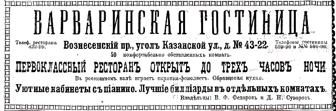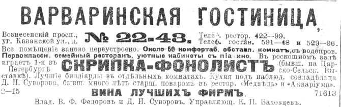 В начале 1800-х гг. оба эти двора купил любимский купец Иван Варварин, владевший домами № 9 и № 18 по Большой Мещанской ул. По описанию у него на Большой Мещанской ул. были еще деревянные постройки, на Вознесенском пр., каменный жилой дом с лабазом внизу, а во дворе - деревянный сарай и сад. В доме купца 2-й гильдии Варварина более 20 лет действовала гостиница, в которой останавливались офицеры и чиновники высоких рангов. В 1809 г. здесь жили генерал-лейтенант в отставке граф Петр Федорович Апраксин, Александр Шепелев, полковник в отставке, Николай Петрович Веригин, подполковник в отставке, майор Иван Иванович Похвиснев. По обычаю того времени Варварин проводил в своем доме лотереи. Упоминание о доме на Вознесенском пр. в Санкт-Петербургских ведомостях (08.02.1824.) говорит о том, что дом на Большой Мещанской был деревянным.