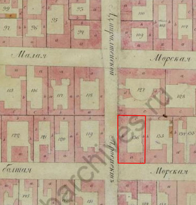 , лист IV. На этом участке показан каменный дом с внутренним двором. Такие очертания плана почти полностью сохранились до нашего времени (см. карту "Яндекса"; только снесен небольшой кусочек флигеля, примыкавший к лицевому дому по Большой Морской улице). Но сам этот дом подвергся значительным перестройкам.