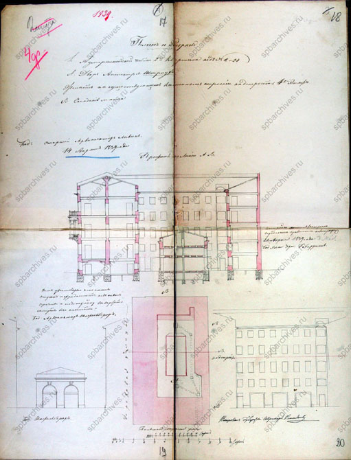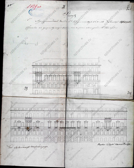 Этот проект был осуществлен (в том числе и эркеры на фасадах), о чем свидетельствуют недатированные фиксационные чертежи (2). по Гороховой улице ((2), лист 8). Имеется также чертеж фасада по Гороховой улице ((2), лист 9), тоже соответствующий проекту 1838 г.