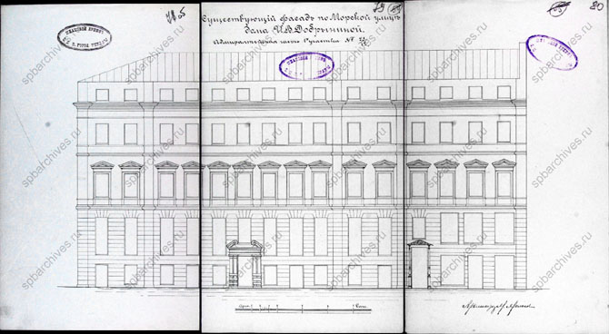 Фасады по и улицам на чертежах 1822 г. ((1), фрагменты листа 5-8; это проект увеличения высоты дверей в первом этаже, в остальном чертежи фактически фиксационные). Сравнение с чертежами фасадов углового корпуса по и улицам 1740-х гг. из коллекции Берхгольца показывает, что к 1798 г. дом был надстроен, а со стороны Большой Морской улицы еще и расширен на 4 оси вправо, при этом был изменен декор фасадов в духе переходной архитектуры от барокко к классицизму 1760-1780-х гг. В 1839 г. дом был перестроен для владельца - аптекаря Штрауха. ((1) лист 17-20). В шапке написано: "Желает на существующем каменном строении надстроить 4-ый этаж". Слева внизу указано имя автора проекта: "Под. Шауфельбергер". Кроме того, здесь видно удостоверение в прочности также за подписью Шауфельбергера. Таким образом, автор проекта - Л. А. Шауфельбергер. - фасады по Малой Морской и Гороховой улицам ((1), лист 21-24). Слева внизу такая же надпись, как на первом листе: "Под. архитектор Шауфельбергер". Фактически проект предусматривает не только надстройку дома, но и полное изменение его фасадов. Они получают классицистический (ампирный) декор. На обоих фасадах сделаны граненые эркеры.