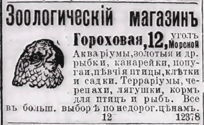 1895: Паровая скоропечатня А. А. Пороховщикова - Гороховая ул., 12 (Народный детский сад. СПб., 1895, титульный лист) 1965: Северо-Западное речное пароходство. Управление - ул. Герцена, 37 Произвенные мастерские - ул. Дзержинского, 12 ([]. C. 161) 1988: Ясли Куйбышевского района № 103 - ул. Герцена, 23 ([]. С. 557)