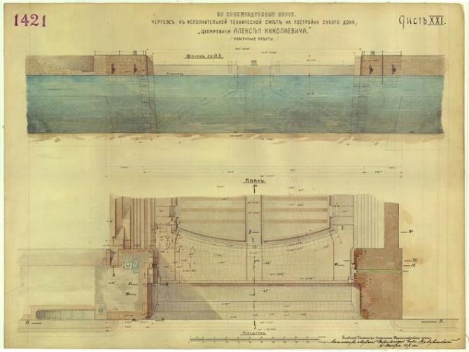 30 июля 1911 г. на Пароходном заводе в Кронштадте был заложен новый, пятый сухой док, специально предназначенный для докования строившихся в то время линейных кораблей типа «Севастополь». Док решили назвать именем Цесаревича Алексея Николаевича.