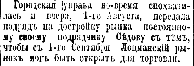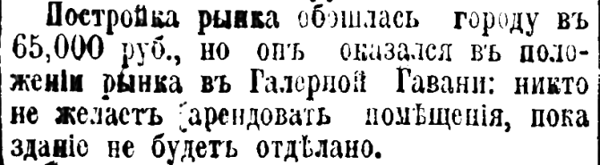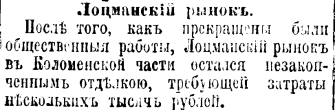 "После того, как прекращены были общественные работы, Лоцманский рынок в Коломенской части остался некаконченным отделкою, требующей затраты нескольких тысяч рублей. Петербургский листок. 1908, № 210 (2 (15) авг.), стр.2 (см. , добавил )
