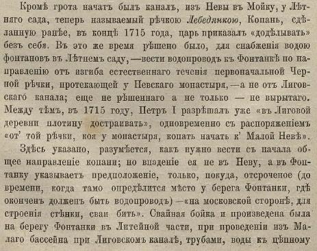 1753 г. - с изображением знатнейших онаго проспектов, изданный трудами Императорской Академии наук и художеств. Издан к 50-летию основания города в 1753 г. «для славы и чести Российской Империи» и дополнен двенадцатью видами города. Составлен в Географическом департаменте Академии наук под наблюдением адъюнкта И.Ф. Трускотта. по всей длине трубы: «Железные трубы и бассейны, которыми проводится вода к фонтанам в Летний сад.»