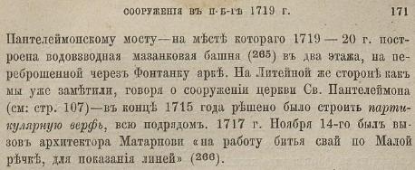 “Службы дворца были расположены на другом берегу Фонтанки, и к ним на месте нынешнего Пантелеймоновского моста вел акведук для фонтанов Летнего сада с проходом наверху. Этот акведук был украшен пышною лепкою, и даже линии арок были вырезными. В результате получился удивительно эффектный вид по Фонтанке вверх от Прачешного моста." Петербург. Художественно-исторический очерк и обзор художественного богатства столицы. Составил В. Курбатов. 1913 г. (Эпоха Императрицы Елисаветы. Эпоха Растрелли).