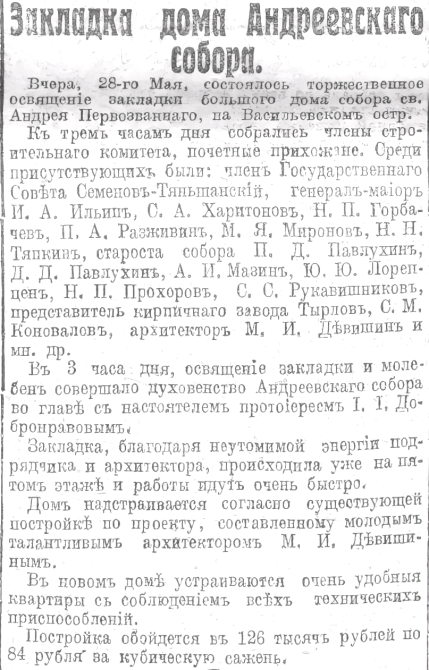 На углу Большого пр. и 11-й линии (№ 32) в 1882-1883 гг. вместо каменного дома, существовавшего со второй половины XVIII в., возвели новый, трехэтажный, по проекту А. Р. Гешвенда для причта Андреевского собора. В 1911 г. гражд. инж. М. И. Девишин надстроил его четвертым и пятым этажами. ([]. С. 90., Mary)