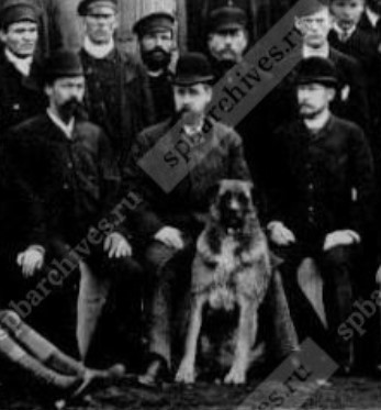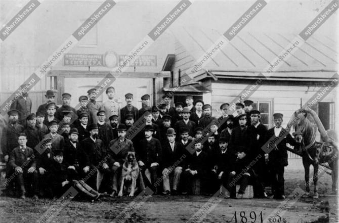 1891. Рабочие и служащие Первой русской фабрики наждачных изделий и точильных приборов с хозяином Н.Н.Струком (сидит в центре, с собакой). Автор съемки не установлен.