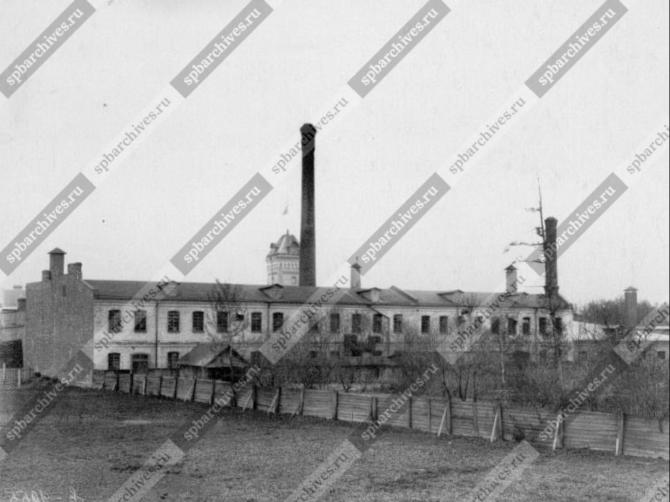**) План двора фабрики наждачных изделий и машиностр. завода Н.Н. Струк. План двора с натурою верен. Архитектор Пирвиц. 10 мая 1900 г. 1883 - 1911. Чертежи дома, зданий фабрики наждачных изделий, машиностроительного завода, кегельбана и паркового павильона на участке, принадлежавшем М.В.Заводовскому, Н.Н.Струку по Головинскому пер., 19-23 и наб. Черной речки, 3-5.