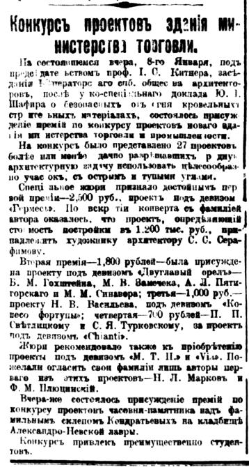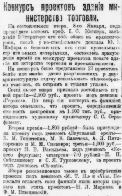 Массивное пятиэтажное здание возведено в 1914-1915 гг. по проекту арх. М. М. Перетятковича для Министерства торговли и промышленности.