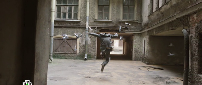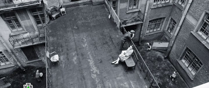 Между прочим, на этих разрезах видна одна исчезнувшая деталь - две изогнутые лестницы (металлические?), спускающиеся на крышу перехода от двери в дворовом корпусе. Могу только догадываться, насколько живописно это выглядело. Теперь этих лестниц нет, и дверной проем висит в воздухе. Моя фотография 14 апреля 2018 г., которую я сделал сквозь грязное стекло второй двери, выходящей на крышу - из лицевого корпуса: