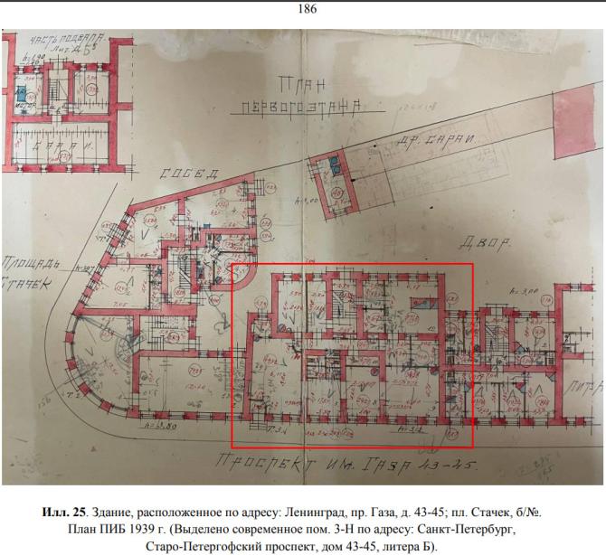 В результате реконструкции 1934-1936 гг. дома по площади и проспекту (стоявшие практически вплотную) были объединены, пристроены к дому 43 по Старо-Петергофскому (эти две части отличаются фасадами от старых крыльев), надстроены до 6 этажей (судя по массивному карнизу, изначально до 5-ти). Все эти рассуждения подтверждаются всевозможными фотографиями. (из книги Л. П. Лаврова "1000 адресов в Санкт-Петербурге", )
