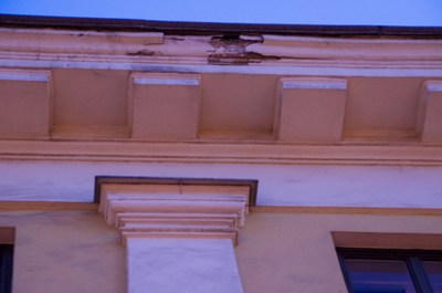 На фронтоне, выходящем сейчас на Почтамтскую улицу, был пмещён герб, написанный на листовом железе, а ниже его на фризе красовалась надпись "Почтовый Стан" /Дело архива Нар. Ком. Почт и Тел. за 1801 год/.