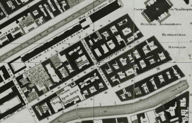 Места эти выходили на Ново-Исаакиевскую ул. (Почтамтская ул. 9), на Выгрузной переулок (Почтамтский пер. 3) и на Большую Исаакиевскую (ныне Ново-Исаакиевскую №12 (Якубовича ул., 12)).